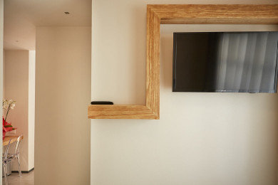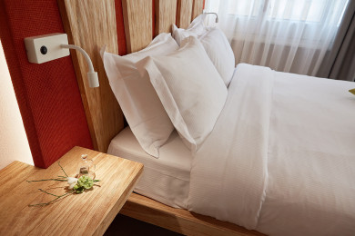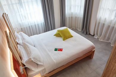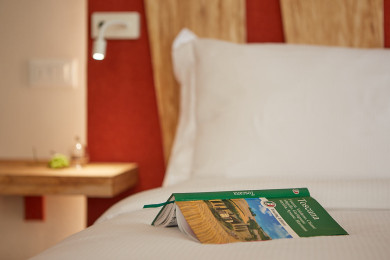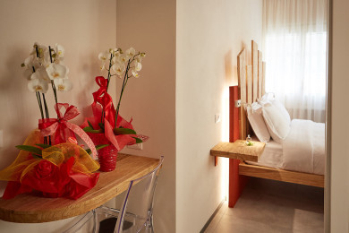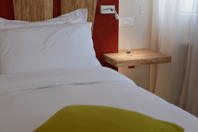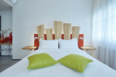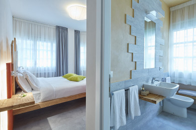 Suite with double bed and living room with sofa bed. It hosts up to four guests.